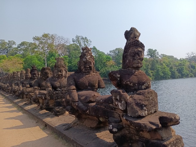 Die rund 100 Figuren am Wassergraben von Angkor Thom sind je zur Hälfte Dämonen- und Schutzgötter, Asuras bzw. Devas, die die für den Hinduismus typische, mystische Schlange Shesha ziehen. In der Frühzeit lebten hier auf 9 Quadratkilometern ca. 100.000 Menschen