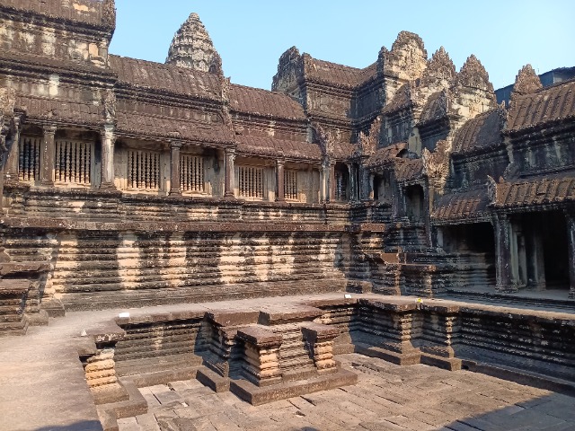 Die ursprünglich hinduistische Tempelanlage besteht überwiegend aus Sandstein, der ohne Mörtel (!) auskam, indem die Erbauer im 12. JH Nuten und Zapfen und Rutschfestigkeit durch das schiere Gewicht riesiger Steinblöcke erreichten. Wie in anderen Tempeln mit ihren ganz speziellen Besonderheiten begeistern mit viel Liebe zum Detail geschaffene Verzierungen, tierische, menschliche und göttliche Figuren und Reliefe. Diese stellen – je nach Tempel – andere Wesen dar, in Angkor Wat himmlische Tempeltänzerinngen und hübsche Göttinnen mit Blumenschmuck