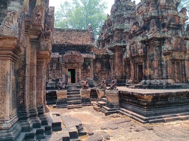 Der sog. Frauentempel, Banteay Srei, hat 2 Besonderheiten. Er ist aus rosafarbenem Sandstein gebaut, der bei entsprechendem Morgen- oder Abendlicht besonderen Charme verspürt. Er ist kein ursprünglich religiöses, sondern privates Bauwerk von reichen Landbesitzern, das im Vergleich zu den umgebenden Tempeln deutlich kleiner, aber dafür sehr reich verziert ist