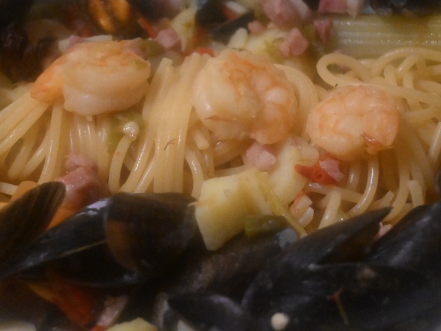 In Wein gedünstete Miesmuscheln und Schrimps an Spaghetti (home made)