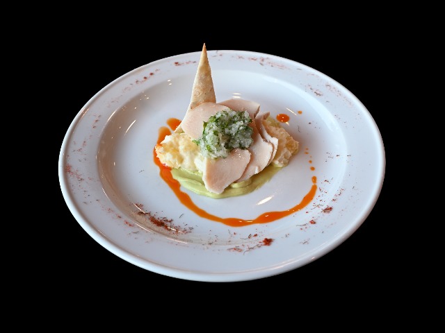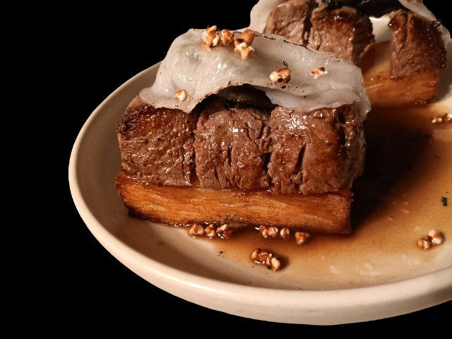 Rinderfiletwürfel auf Kartoffel-Mille-Feuille mit Schnecken, Lardoschinken und Haselnüssen